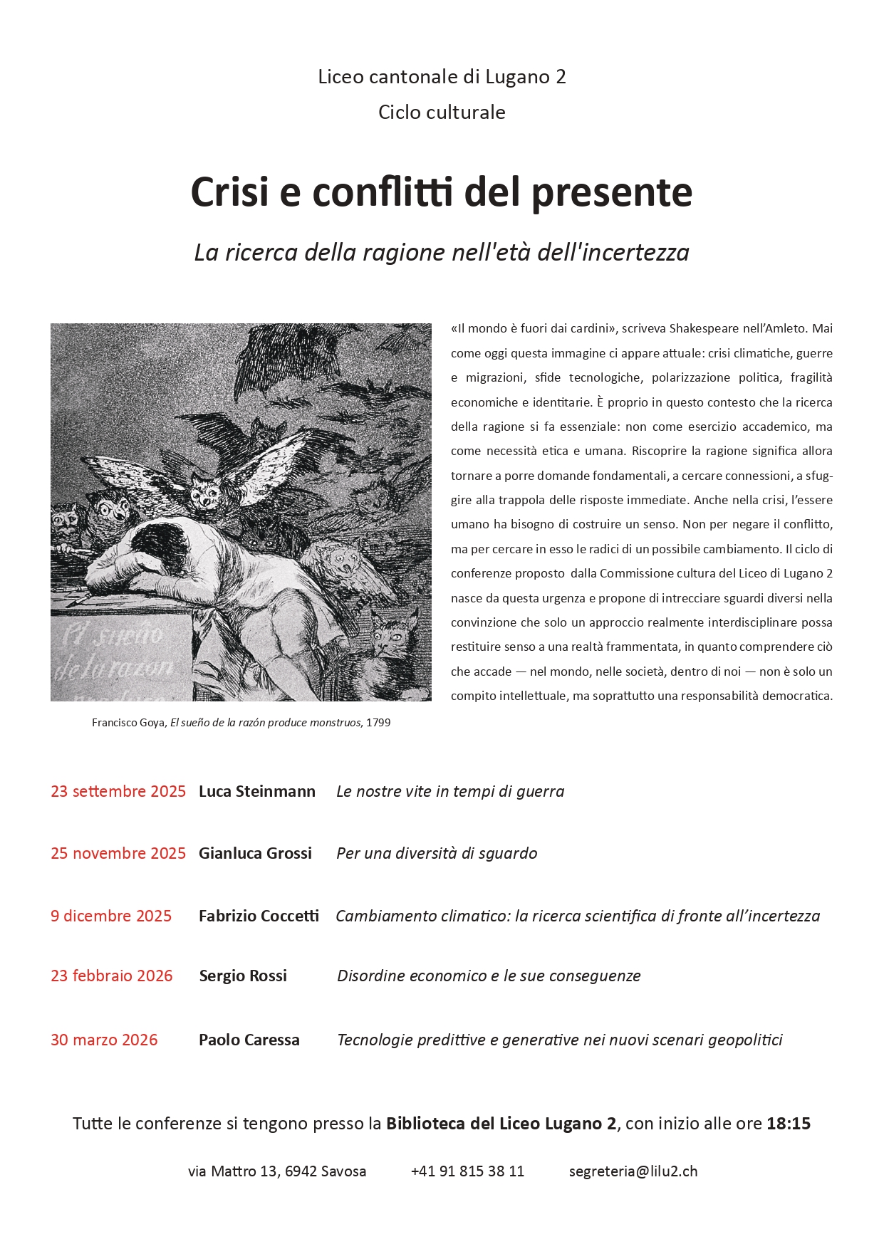 «Il mondo è fuori dai cardini», scriveva Shakespeare nell’Amleto. Mai come oggi questa immagine ci appare attuale: crisi climatiche, guerre e migrazioni, sfide tecnologiche, polarizzazione politica, fragilità economiche e identitarie. È proprio in questo contesto che la ricerca della ragione si fa essenziale: non come esercizio accademico, ma come necessità etica e umana. Riscoprire la ragione significa allora tornare a porre domande fondamentali, a cercare connessioni, a sfuggire alla trappola delle risposte immediate. Anche nella crisi, l’essere umano ha bisogno di costruire un senso. Non per negare il conflitto, ma per cercare in esso le radici di un possibile cambiamento. Il ciclo di conferenze proposto dalla Commissione cultura del Liceo di Lugano 2 nasce da questa urgenza, intrecciando sguardi diversi nella convinzione che solo un approccio realmente interdisciplinare possa restituire senso a una realtà frammentata, in quanto comprendere ciò che accade — nel mondo, nelle società, dentro di noi — non è solo un compito intellettuale, ma soprattutto una responsabilità democratica.