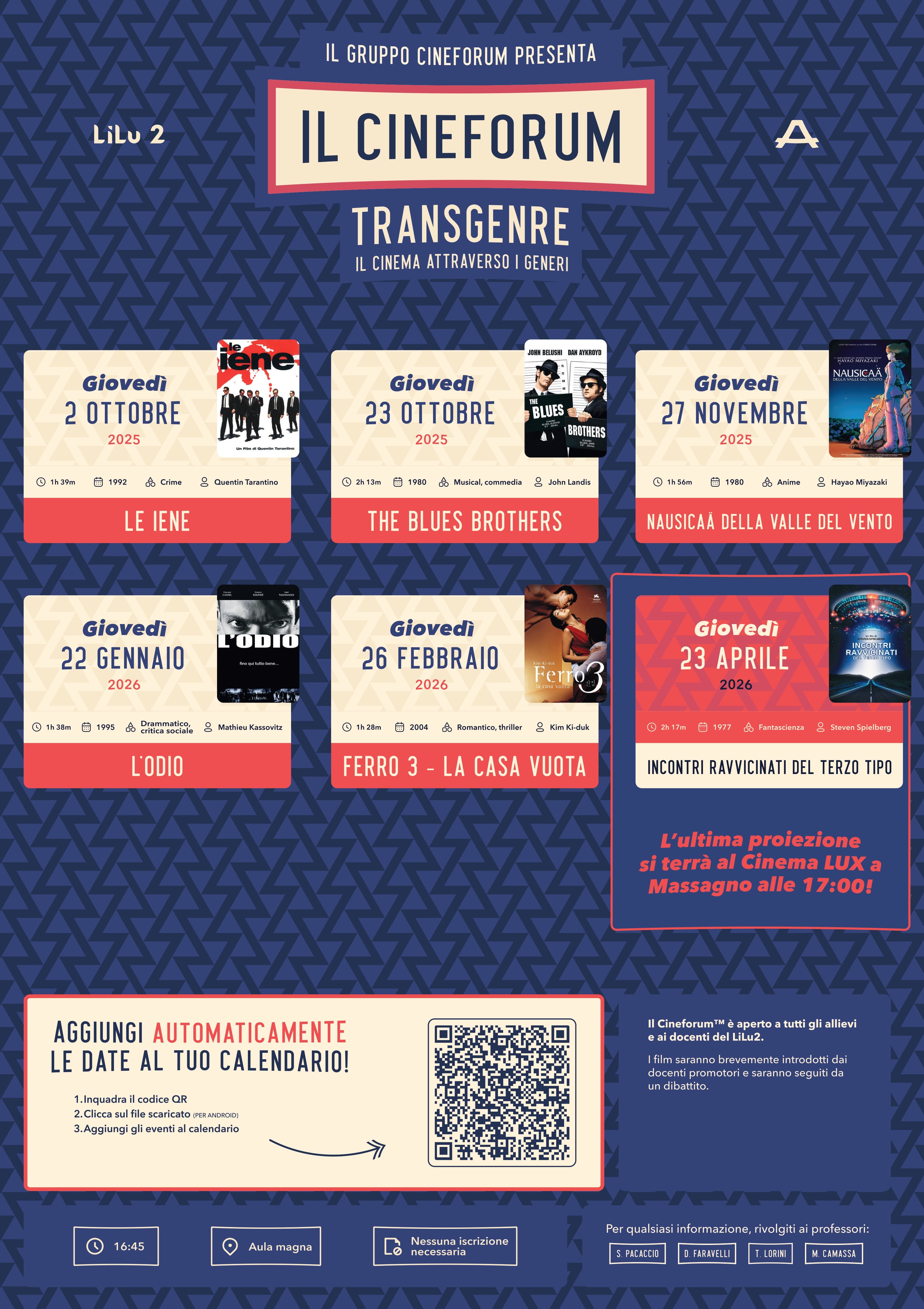 La locandina della rassegna è affissa all’ingresso dell’aula magna. Per maggiori informazioni potete rivolgervi ai proff. M. Camassa, D. Faravelli, T. Lorini e S. Pacaccio.